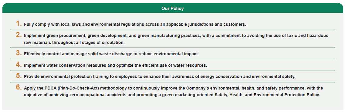 In alignment with its longstanding commitment to balanced development and sustainable operations, Longwell has established a Safety, Health, and Environmental Protection Policy, formally approved and signed by the President. The Company integrates sustainable development principles into its daily operations and strictly complies with applicable environmental laws and regulations at both national and local levels. Longwell fully complies with the highest environmental standards in guiding its manufacturing, management, and service activities, with the objective of continuously delivering environmentally and socially beneficial products. Environmental protection, occupational health, and workplace safety constitute fundamental elements of the Company's sustainability framework.